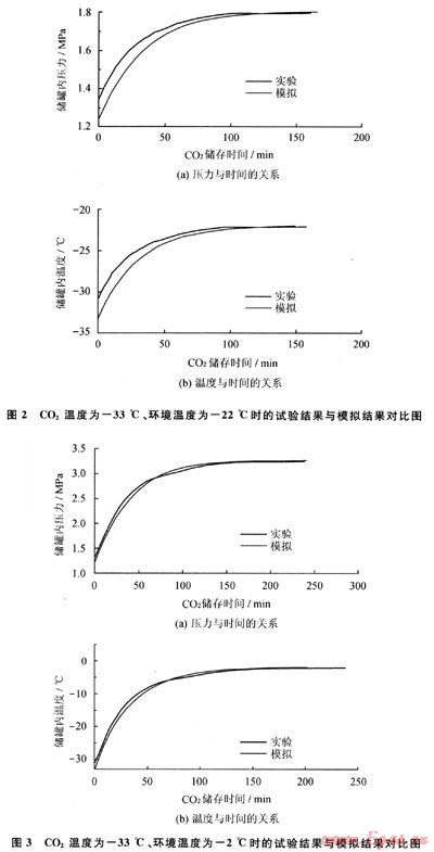 在相同初始充滿率下,測試不同環(huán)境溫度時儲存壓力及溫度的變化情況。試驗采用不銹鋼小型儲罐,運用自然升壓法測定儲罐內(nèi)介質(zhì)的蒸發(fā)量,利用恒溫槽改變介質(zhì)溫度及環(huán)境溫度,利用壓力傳感器得出儲槽內(nèi)壓力變化。試驗裝置如圖1所示,C02溫度為-33℃,環(huán)境溫度為-22℃時的試驗結(jié)果與模擬結(jié)果對比見圖2,CO2溫度為-33℃,環(huán)境溫度為-2℃時的試驗結(jié)果與模擬結(jié)果對比見圖3。