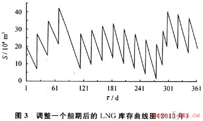2) 應(yīng)用動(dòng)態(tài)數(shù)學(xué)模型,通過(guò)LNG庫(kù)存曲線(圖3)可知所需罐容為41.87×104m,若選用常規(guī)l6×104m的儲(chǔ)罐,應(yīng)配置2.62個(gè)儲(chǔ)罐,取整為3個(gè)儲(chǔ)罐;若選用18×104m的儲(chǔ)罐,則應(yīng)配置2.33個(gè),取整為3個(gè)儲(chǔ)罐。由此可見(jiàn),采用靜態(tài)模型計(jì)算均勻來(lái)船情況下的LNG儲(chǔ)罐罐容尚且合理,而一旦來(lái)船期變化較大,靜態(tài)模型計(jì)算結(jié)果明顯不合理。而動(dòng)態(tài)數(shù)學(xué)模型的計(jì)算結(jié)果更為合理。