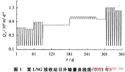 該LNG接收站項(xiàng)目LNG運(yùn)輸船選擇21.5×104m3的主力船型,其2013年期的LNG接收站日外輸氣量(QS)曲線(同時(shí)也是匹配下游用氣市場(chǎng)的日用氣量曲線)如圖1所示。用戶類(lèi)型包括管道外輸氣用戶(12.4%)、LNG槽車(chē)用戶(18.5%)及燃?xì)怆姀S用戶(69.1%)。