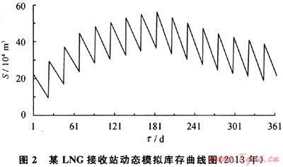 2) 應(yīng)用動(dòng)態(tài)數(shù)學(xué)模型進(jìn)行計(jì)算的結(jié)果為:所需有效罐容為56.81×104m3,LNG庫(kù)存(S)曲線如圖2所示,若選用常規(guī)16×104m3的儲(chǔ)罐,應(yīng)配置3.55個(gè)儲(chǔ)罐,取整為4個(gè)儲(chǔ)罐;若選用18×104m3的儲(chǔ)罐,則應(yīng)配置3.16個(gè),取整為4個(gè)儲(chǔ)罐。由此可見(jiàn),該動(dòng)態(tài)數(shù)學(xué)模型與原靜態(tài)估算模型的結(jié)論一致(原靜態(tài)模型的結(jié)果其實(shí)也是經(jīng)過(guò)設(shè)計(jì)單位內(nèi)部開(kāi)發(fā)的動(dòng)態(tài)仿真軟件校核過(guò)的)。