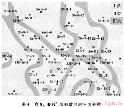 由于儲層屬性模型提供了空間任意位置孔隙度、滲透率的變化,所以可以準確地預(yù)測有效儲層的空間分布。如圖4所示為盒8上亞段2層有效砂體平面分布預(yù)測結(jié)果。依據(jù)儲層孔隙度和滲透率的大小,可以將盒8段儲層砂體分為以下3類。