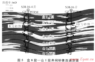 由此可見,應(yīng)用儲層三維地質(zhì)模型,可以準確地預(yù)測有效儲層的規(guī)模及其空間分布,通過沿任意方向切取垂向和水平剖面,可以對儲層進行定量評價。圖5為通過儲層滲透率三維模型切取的過井剖面,從圖中可以直觀地看出儲層砂體的井間連通或者尖滅情況,定量分析儲層物性的橫向變化,準確地界定儲層砂體的幾何形態(tài)。如S38-16井生產(chǎn)近半年,關(guān)井63d,在盒8下亞段1層第10號砂體測得地層壓力為19.7MPa,而S38-16-4井在同一地層的8號砂體地層壓力為29.3MPa,反映兩口井砂體不連通或物性差別極大,與儲層地質(zhì)模型基本吻合。通過工區(qū)內(nèi)16口測壓井、2個井組干擾試驗以及投產(chǎn)井生產(chǎn)動態(tài)特征,證實了所建立的三維地質(zhì)模型精度較高,客觀地反映了有效儲層空間分布,也表明所提出的建模方法對低滲透河流相儲層建模是有效的。