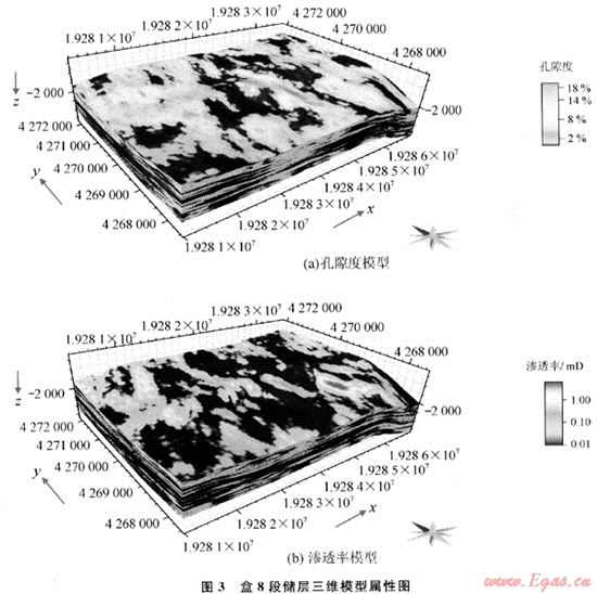 從表2中可以看出:由于盒8上亞段儲層和盒8下亞段儲層分別為曲流河和辮狀河沉積相,其儲層屬性的變差函數(shù)存在較大的差異。以孔隙度為例,雖然二者的主變程方向都為近于南北向,并且都可以用指數(shù)模型進行擬合,但盒8上亞段儲層變差函數(shù)的主變程是1645m,而盒8下亞段儲層是819m,說明盒8上亞段儲層孔隙度沿主變程方向連續(xù)性更好。但是盒8上亞段儲層孔隙度次變程為425m,比盒8下亞段儲層孔隙度次變程503m要短68m,說明盒8上亞段儲層孔隙度側(cè)向變化比盒8下亞段快。二者的垂直變差函數(shù)分別為7.8m和6m,說明孔隙度在垂直方向上變化遠比平面方向變化快,也就是說,儲層的垂直方向的非均質(zhì)性遠強于平面非均質(zhì)性。盒8上亞段與盒8下亞段儲層滲透率變差函數(shù)具有相似的變化規(guī)律,只是主變程和次變程都比孔隙度小,說明滲透率在各方向的變化都比孔隙度快,反映儲層滲透率的非均質(zhì)性比孔隙度強。由此可見,準確變差函數(shù)的求取,可有效反映儲層非均質(zhì)性大小及方向。