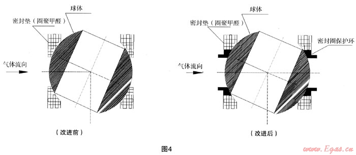 針對(duì)以上的原因及現(xiàn)象,結(jié)合液壓子站工作特點(diǎn)研究認(rèn)為:閥門內(nèi)漏原因和密封圈損壞現(xiàn)象提出,如果在氣動(dòng)球閥內(nèi)加一保護(hù)密封圈裝置,避免密封圈直接與雜質(zhì)、高溫氣液、液壓沖擊接觸,此問題就可得到較好的解決。改進(jìn)前后詳見圖4。