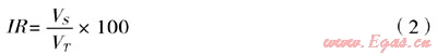 在埋地管道陰極保護(hù)電位差中,VI是外加陰極保護(hù)電壓中真正起到保護(hù)管道作用的一部分電壓,VS是為克服土壤阻抗而損失的電壓,對(duì)于保護(hù)管道并沒(méi)有作用,所以,要獲得較好的陰極保護(hù)效果,VI應(yīng)較大而VS較小,陰極保護(hù)的水平可以用VI的大小來(lái)衡量。然而,在實(shí)際的檢測(cè)中很難對(duì)VI進(jìn)行測(cè)量,而較容易測(cè)量VS的值,因此,可以利用VS值的大小來(lái)評(píng)價(jià)陰極保護(hù)的作用,通常是利用其占埋地管道外加陰極保護(hù)電位差的百分比進(jìn)行表示,公式如下:
