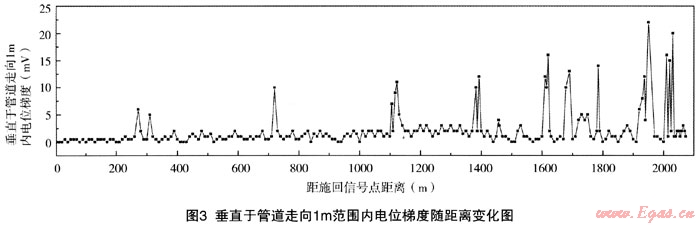 由于公司燃?xì)夤芫W(wǎng)采用了3種防腐材料,3種防腐材料都有這各自的特點(diǎn):3層PE防腐層絕緣性較好,防腐層沒(méi)有破損的情況下不會(huì)出現(xiàn)漏電現(xiàn)象,而煤瀝青及冷纏帶防腐層的絕緣性較差,在管道上施加DCVG檢測(cè)電流,在管道周邊會(huì)出現(xiàn)幾毫伏的微小漏電電位。因此,在試探性檢測(cè)后提出以下檢測(cè)方案:在管道檢測(cè)過(guò)程中對(duì)3層PE類防腐層采用傳統(tǒng)的DCVG檢測(cè)方法即尋找防腐漏點(diǎn)來(lái)判斷管道防腐層的好壞。對(duì)于采用煤瀝青及冷纏帶防腐的鋼制管道采用檢測(cè)垂直于管道走向方向約1m內(nèi)的地表電位差,并繪制管道沿途電位差值與距離的關(guān)系確定管道防腐層的好壞。
