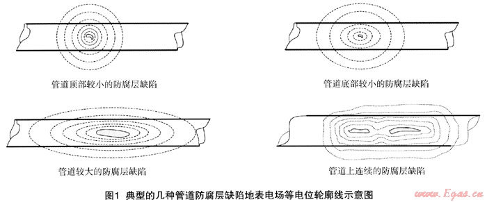 根據(jù)DCVG檢測(cè)的技術(shù)原理,通過(guò)對(duì)埋地管道防腐層缺陷處地表電場(chǎng)檢測(cè),繪出缺陷處地表電場(chǎng)等位線輪廓形狀,根據(jù)繪制的地表電場(chǎng)等電位線可以判斷埋地管道防腐層缺陷的形狀以及缺陷所在管體的位置。典型的電場(chǎng)等電位輪廓線有圖1所示的幾種[3]。