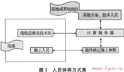 該方法不僅解決了數(shù)據(jù)計(jì)算速度問題,而且計(jì)算結(jié)果可以保存在服務(wù)器的數(shù)據(jù)庫中,可以由多個(gè)手機(jī)客戶端反復(fù)調(diào)用,便于多名工程技術(shù)人員在不同地區(qū)、環(huán)境下共同參與指導(dǎo)、監(jiān)督工作,使現(xiàn)場(chǎng)在遇到復(fù)雜情況時(shí)可以及時(shí)得到油氣田資深專家的意見,人員之間的協(xié)調(diào)方式如圖2所示。