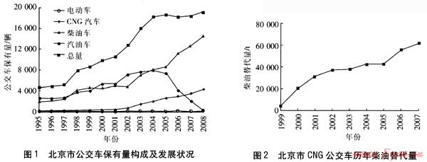 圖1為北京市公交車保有量構(gòu)成及發(fā)展?fàn)顩r,它顯示了1995—2008年北京市公交車總量以及其中汽油車、柴油車、CNG車和電動(dòng)車這4種不同燃料類型汽車的發(fā)展趨勢(shì)。可以看出,在1999—2008年這10年間,北京市天然氣公交車保有量的年均(3年滑動(dòng)平均)增長(zhǎng)率達(dá)到了21%,遠(yuǎn)高于同期北京市公交車總保有量7%的增長(zhǎng)率,天然氣公交車同時(shí)也是各類公交車型中增長(zhǎng)速度最快的車型。