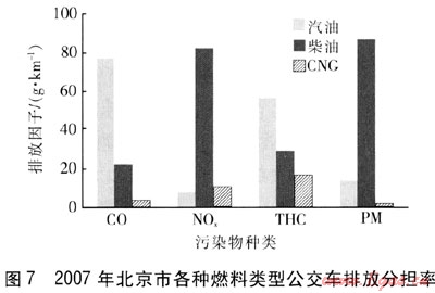 根據(jù)對(duì)2007年北京市現(xiàn)有公交車排放清單的分析,可以獲得各燃料類型公交車的排放分擔(dān)率,見(jiàn)圖7。雖然CNG公交車在北京市公交車車隊(duì)中占有20%的比例,但是不論是哪種污染物,其排放分擔(dān)率都顯著低于20%,尤其對(duì)于北京市大氣環(huán)境最為重要的控制污染物PM而言,其1%的低分擔(dān)率意義非同小可。對(duì)于公交車最引人關(guān)注的NOx和PM兩種污染物,柴油公交車都是最主要的排放源,其分擔(dān)率都超過(guò)了80%,使用CNG公交車替代柴油公交車可以有效地降低公交車NOx和PM總排放量。