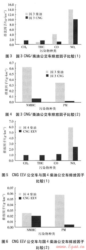 圖5、6為目前北京市排放控制水平最高的CNG EEV車型與國(guó)4柴油車排放的對(duì)比??梢钥闯觯?/span>
