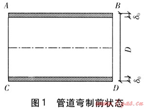 天然氣高壓管道進(jìn)行彎制時,管道彎曲段受力變形,彎制前狀態(tài)見圖1,彎制后狀態(tài)見圖2,彎曲段Ⅰ′-Ⅰ′斷面見圖3。管道在彎制過程中,內(nèi)側(cè)管壁受壓力,由于擠壓作用管壁由直線形(如CD段)變成圓弧形(如C′D′段),管壁由于壓縮變短而增厚;外側(cè)管壁受拉力,由于拉伸作用管壁由直線形(如AB段)變成圓弧形(如A′B′段),管壁由于拉伸變長而減薄。管壁減薄會使強(qiáng)度降低,為保證管壁減薄后仍有足夠強(qiáng)度,要求管壁有一定厚度,在彎曲段管壁減薄應(yīng)均勻。