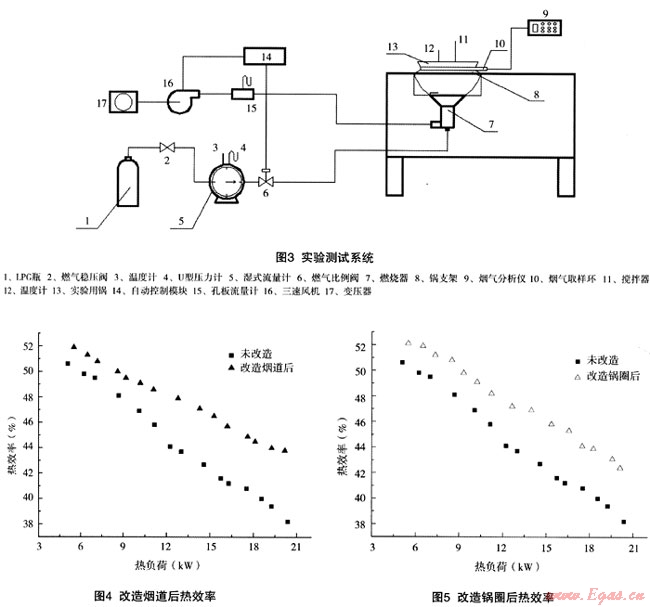 為對比改造前后中餐灶熱效率,在原有額定負荷為18kW的紅外中餐燃氣灶的基礎上對爐膛進行煙道、鍋圈和爐膛結(jié)構的改造,并對改造后的熱效率進行測試,實驗裝置的布置和流程如圖3所示。