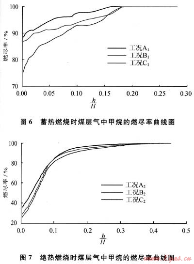 從圖3~5中還可以看出,采用蓄熱式燃燒時(shí),煤層氣中甲烷濃度為5%、4%、3%的最高溫度分別為1270K、1100K、867K,最高溫度分別出現(xiàn)在h/H為0.18、0.19、0.2附近。而h/H為0.2是惰性顆粒形成床層的近似高度,由此可知,最高溫度出現(xiàn)的位置在床層的上部,并隨著煤層氣中甲烷濃度的降低略向上移,這是與煤層氣中甲烷的燃燒位置分不開的。從圖6中可以看出,隨著煤層氣中甲烷濃度的降低,甲烷完全燃盡的位置逐漸向上推移,由此造成在爐膛中出現(xiàn)最高溫度的位置逐漸上移。這是由于隨著煤層氣中甲烷濃度的降低,爐膛的溫度和石英砂顆粒的溫度降低,這樣就推遲了煤層氣中甲烷從點(diǎn)火到完全燃盡所用的時(shí)間,在流量一定的情況下,甲烷完全燃盡所出現(xiàn)的位置便向上推移,從而使最高溫度出現(xiàn)的位置向上推移。如圖6所示,在A1、B1、C13種工況下,h/H為0.2位置處,煤層氣中的甲烷燃盡率都接近100%,說明煤層氣中的甲烷在惰性顆粒組成的床層以內(nèi)就基本完成了燃燒反應(yīng)。