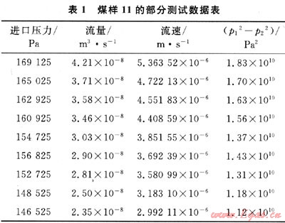 RMT-150B伺服試驗機加載的軸向力4kN,圍壓2MPa,為了保證測試過程封閉良好,所加氣壓不超過圍壓2MPa。實驗采用“倒退法”:即先將氣壓調(diào)到較高值燃后關(guān)閉穩(wěn)壓閥門,測試一系列壓力梯度對應(yīng)的流量。以煤樣11為例,由于出口端直通大氣,因此式(4)中的p2=p0=101325Pa,部分測試數(shù)據(jù)見表1,計算的滲透率為0.2mD,流速與壓力平方差的關(guān)系見圖2。