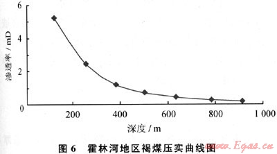 煤層氣勘探試驗注入、壓降測試煤層埋深900m,煤層滲透率為0.91mD。對煤層進行壓實曲線分析表明(圖6):煤層埋深100~500m,每增加100m,滲透率降低2.1mD;而在埋深500~900m,埋深每增加100m,滲透率降低0.1mD。說明埋藏早期以大孔隙壓實為主,后期以微孔隙壓實為主??傮w本區(qū)煤儲層物性好,滲透性較高,淺部煤層滲透率將更高。