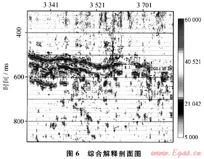 為更好地突出煤層氣AVO異常,把截距、梯度數(shù)據(jù)體進行相減運算,取差值的振幅包絡(luò)屬性作圖,獲得綜合解釋剖面圖(圖6)。由于煤層氣的AVO異常特點是截距與梯度符號相反,因此差值增強了與煤層氣富集相關(guān)的AVO異常,而削弱AVO反演噪音。截距、梯度差值的包絡(luò)屬性,將把頂、底板反射界面相關(guān)的同相軸異常合并顯示為同一個同相軸,突出了AVO異常范圍。圖6中沿2條藍線(即5#煤層頂板、底板的位置)的紫紅色位置是煤層氣富集區(qū)。