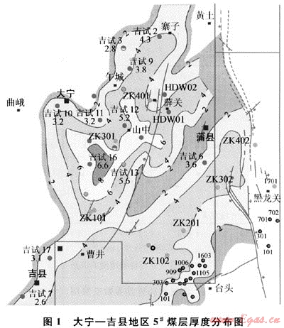 大寧-吉縣地區(qū)位于鄂爾多斯盆地東緣晉西撓褶帶中南段,呈西傾單斜構(gòu)造。主要含煤地層為下二疊統(tǒng)山西組,含煤層數(shù)有十幾層,其中山西組的5#煤層全區(qū)分布較穩(wěn)定,是煤層氣勘探開發(fā)主要目的層[2~4],煤層埋深為700~1100m,厚度為1.5~7.2m,其中厚度超過5m的煤層主要位于午城-窯渠地區(qū),向東煤層厚度逐漸變薄(圖1)。