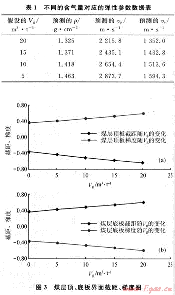 建立地質(zhì)模型:煤層頂板、煤層、煤層底板等3層。通過數(shù)據(jù)統(tǒng)計分析確定煤層頂、底板泥巖彈性參數(shù):vp=3995.9m/s、vs=2048m/s、ρ=2.55g/cm3,煤儲層的彈性參數(shù)可通過3個轉(zhuǎn)化關(guān)系式計算獲得。假設(shè)vg從20m3/t變化到0,根據(jù)3個轉(zhuǎn)化關(guān)系式計算出相應(yīng)的煤層氣儲層彈性參數(shù)(表1),將計算的彈性參數(shù)代入Shuey簡化公式[7],求得與假設(shè)的各個Vg值相對應(yīng)的截距和梯度屬性(圖3)。