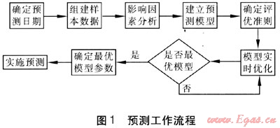 其工作過程如下:分析當(dāng)前需要預(yù)測(cè)日期前幾天負(fù)荷及歷史同期負(fù)荷變化情況,實(shí)時(shí)分析近期主要影響因素,作為模型輸入變量。對(duì)建模樣本數(shù)、是否考慮星期及節(jié)假日影響、模型主要變量數(shù)及模型結(jié)構(gòu)參數(shù)等尋優(yōu)。相當(dāng)于建立廠一系列不同的模型,根據(jù)歷史預(yù)測(cè)結(jié)果與實(shí)際結(jié)果的誤差大小確定評(píng)優(yōu)準(zhǔn)則及相應(yīng)的權(quán)值,由式(3)計(jì)算得出誤差平方和最小時(shí)對(duì)應(yīng)的預(yù)測(cè)模型參數(shù),再以評(píng)估確定的最佳模型進(jìn)行預(yù)測(cè)。當(dāng)預(yù)測(cè)結(jié)果的真值出現(xiàn)后,進(jìn)一步對(duì)預(yù)測(cè)結(jié)果進(jìn)行后評(píng)價(jià)及誤差統(tǒng)計(jì),為下一步預(yù)測(cè)時(shí)確定或修正評(píng)優(yōu)準(zhǔn)則提供依據(jù)。預(yù)測(cè)工作流程見圖1。