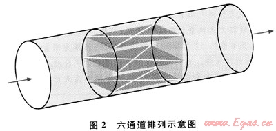 1) 與三、四聲道流量計(jì)相比,以特別方式排列的六聲道超聲波流量計(jì)有以下的決定性優(yōu)點(diǎn):①抗干擾性。根據(jù)高斯-切比雪夫(Gauss-Chebyshev)理論排列聲道,并且聲道相互交叉,使流量計(jì)很大程度上不受氣體流型的影響。因此,可以不需要整流器甚至在氣體流動受到渦流、不對稱等干擾的情況下也可以實(shí)現(xiàn)高精度的測量。②冗余性。如果其中任何一個(gè)或兩個(gè)聲道失效,六聲道流量計(jì)將不會失去計(jì)量能力,失效的聲道可以通過重新復(fù)值來得到恢復(fù)。