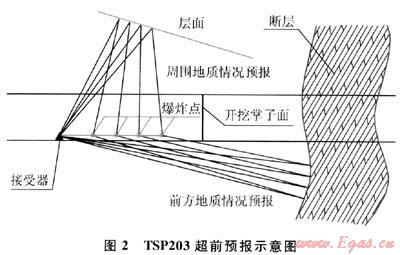該方法屬于施工過(guò)程中的長(zhǎng)距離地質(zhì)預(yù)報(bào)方法,在宏觀預(yù)報(bào)的指導(dǎo)下,主要應(yīng)用TSP 203探測(cè)、斷層參數(shù)預(yù)測(cè)和地面地質(zhì)體投射等技術(shù)手段,對(duì)隧道隧洞洞體前方100~150m不良地質(zhì)體進(jìn)行長(zhǎng)距離超前地質(zhì)預(yù)報(bào)。TSP203超前預(yù)報(bào)示意圖如圖2所示。該方法預(yù)報(bào)結(jié)論相對(duì)可靠,30min即可以做好準(zhǔn)備工作,測(cè)量時(shí)間小于90min,操作簡(jiǎn)單,對(duì)施工干擾小,但其測(cè)量出的結(jié)果需要采用超前鉆探進(jìn)行驗(yàn)證。