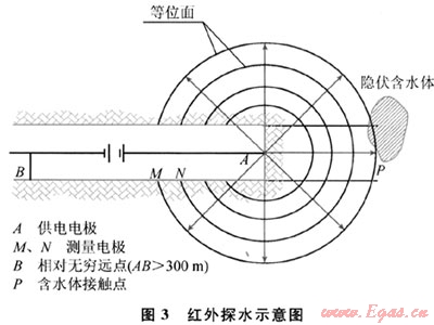 HY-303紅外探水儀,能探測(cè)20~30m范圍內(nèi)的地下水狀況?;驹恚寒?dāng)掘進(jìn)前方30m范圍內(nèi)存在含水構(gòu)造或溶洞時(shí),前方災(zāi)害源產(chǎn)生的紅外異常場(chǎng),必然會(huì)傳播到掘進(jìn)后方,因而在掘進(jìn)后方隧道的側(cè)壁上能提前發(fā)現(xiàn)災(zāi)害源產(chǎn)生的紅外異常場(chǎng)。其特點(diǎn)為:①距離短,一般為35m;②只定性告知35m范圍內(nèi)有無(wú)水,至于水壓、水量、具體哪個(gè)里程則探測(cè)不出;③適用于任何地層中定性判斷探測(cè)點(diǎn)前方“有沒(méi)有水”及水體存在方位;④儀器小巧輕便,操作簡(jiǎn)單,可實(shí)現(xiàn)全空間全方位探測(cè);⑤資料分析簡(jiǎn)潔、快速、直觀;⑥基本不占用隧道施工時(shí)間。