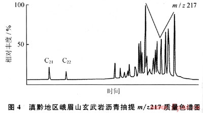 另據(jù)玄武巖瀝青的m/z217質(zhì)量色譜圖(圖4),規(guī)則甾烷呈近“V”字形,C27占優(yōu)勢,反映水生生物輸入有機(jī)質(zhì)較多,利用C27-C28-C29甾烷相對含量判斷烴源巖母質(zhì)類型(圖5),表明除水生生物外,還有部分腐殖型有機(jī)質(zhì)的輸入;由于上覆的沙灣組在漢王場-青神-犍為-珙縣以東地區(qū),已相變?yōu)楹谏搸r夾薄層石灰?guī)r,有時可見薄層碳質(zhì)頁巖和煤層[3],故推測氣源可能有上二疊統(tǒng)煤系地層的貢獻(xiàn)。