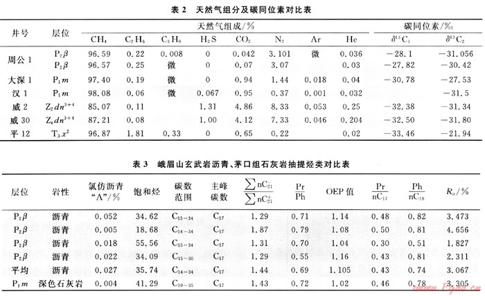 周公山玄武巖氣藏生產(chǎn)至今已愈17a,屬次生氣藏為學(xué)界共識,但氣源來自何層尚有歧義[3、5]。據(jù)表2可知,周公1井玄武巖與威遠(yuǎn)震旦系氣組成差別大,后者N2、CO2、H2S、He含量高,CH4低,多數(shù)人認(rèn)為氣源主要來自寒武系筇竹寺組,而川西南部地區(qū)受加里東運(yùn)動影響,該套烴源巖剝蝕,殘余厚度僅0~70m。天然氣碳同位素揭示,玄武巖天然氣具油型氣特征,與川西南部上三疊統(tǒng)天然氣碳同位素有明顯差異。地面露頭地化分析(表3)表明,玄武巖瀝青苗的飽和烴色譜均以正構(gòu)烷烴為主,主峰都為nC17奇碳數(shù)優(yōu)勢,Pr/Ph為0.69、Pr/nC17為0.43、Ph/nC18為0.74、∑nC21-/∑nC21+為1.44、Ro為3.067%,與下伏的下二疊統(tǒng)石灰?guī)r具良好的親緣關(guān)系,推測烴源來自下二疊統(tǒng)。