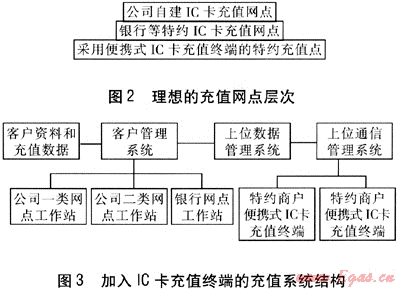 為了保證客戶能夠方便地充值,必然要增加充值網(wǎng)點(diǎn),全部由公司自建對(duì)公司而言是一個(gè)沉重的負(fù)擔(dān)。對(duì)于客戶,能夠方便地進(jìn)行充值是其最需要的服務(wù)。因此,充值網(wǎng)點(diǎn)社會(huì)化應(yīng)是一種趨勢(shì)。理想的充值網(wǎng)點(diǎn)層次見圖2。上層是公司自建的IC卡充值網(wǎng)點(diǎn),成本最高,數(shù)量最少,可開展的業(yè)務(wù)類型較多,是公司直接對(duì)外的窗口。中間層是借助銀行等網(wǎng)點(diǎn)而建立起來的IC卡充值網(wǎng)點(diǎn)。底層是采用便攜式IC卡充值終端的住宅區(qū)物業(yè)、小型商場(chǎng)、商店等廣泛分布的公司特約充值點(diǎn),成本最低,數(shù)量最多。加入IC卡充值終端的充值系統(tǒng)結(jié)構(gòu)見圖3。