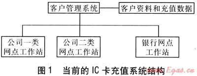 各網(wǎng)點(diǎn)通過我公司開發(fā)的充值系統(tǒng)進(jìn)行充值。各網(wǎng)點(diǎn)建立一個(gè)小型局域網(wǎng),該局域網(wǎng)通過數(shù)字線路或ADSL+VPN的形式與公司局域網(wǎng)相連,在各網(wǎng)點(diǎn)的計(jì)算機(jī)上安裝充值系統(tǒng)客戶端,通過客戶端進(jìn)行IC卡充值,并與公司服務(wù)器的客戶管理系統(tǒng)進(jìn)行通信。當(dāng)前的IC卡充值系統(tǒng)結(jié)構(gòu)見圖1。