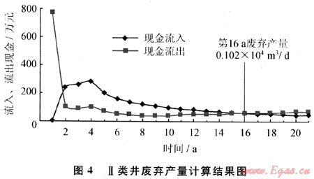 氣井20a評價期,在目前技術經(jīng)濟條件下,生產(chǎn)到第16a時,單井產(chǎn)量0.102×104m3/d,當年現(xiàn)金流出70.19萬元,總銷售收入70.18萬元(圖4)。為此,Ⅱ類井的廢棄產(chǎn)量為0.102×104m3/d,經(jīng)濟生產(chǎn)期17a。