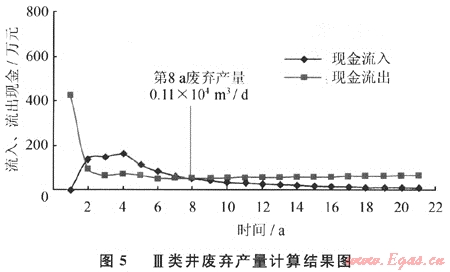 氣井20a評價期,在目前技術經(jīng)濟條件下,氣井生產(chǎn)到第8a時,單井產(chǎn)量0.11×104m3/d,當年現(xiàn)金流出60.86萬元,當年總銷售收入60.74萬元(圖5)。為此,Ⅲ類井的廢棄產(chǎn)量為0.11×104m3/d,經(jīng)濟生產(chǎn)期8a。