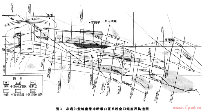 通過對基準面統(tǒng)一處理后的資料進行連片解釋及變速成圖,獲得的成果圖構(gòu)造形態(tài)自然,無畸變現(xiàn)象(圖3),且欲鉆井吻合較好。地質(zhì)成果進一步查明了南緣沖斷帶的構(gòu)造圈閉形態(tài)、斷裂展布特征;重新落實了安集海構(gòu)造、霍爾果斯構(gòu)造、瑪納斯構(gòu)造、吐谷魯構(gòu)造、呼圖壁構(gòu)造、東灣構(gòu)造的構(gòu)造形態(tài)、高點位置、圈閉規(guī)模;新發(fā)現(xiàn)了霍爾果斯下盤構(gòu)造、瑪納斯下盤構(gòu)造、吐谷魯下盤構(gòu)造和瑪北構(gòu)造。通過構(gòu)造圈閉評價,指明了瑪納斯構(gòu)造、吐谷魯構(gòu)造、呼圖壁構(gòu)造為該區(qū)油氣勘探的最有利的鉆探目標區(qū),同時瑪北構(gòu)造和安集海構(gòu)造為該區(qū)次一級的油氣勘探的鉆探目標區(qū),并提供了3口建議井位,為南緣地區(qū)的勘探開發(fā)提供了重要的基礎資料,對南緣沖斷帶下步勘探部署具有指導意義,效果顯著。
