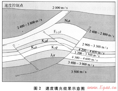 2) 以解釋好的層位及斷層為邊界條件,合理布設速度控制點,將層速度填充在控制點上,速度值由速度平面圖讀出,其變化范圍、變化梯度與速度平面圖上變化一致。