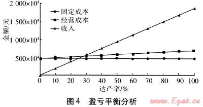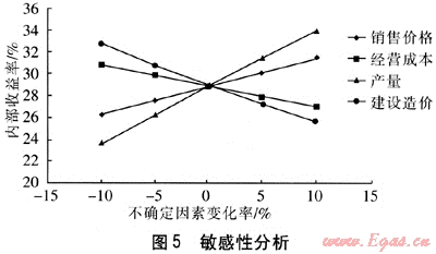 盈虧平衡分析主要是測算項目投產(chǎn)后盈虧平衡點(BEP),以考察項目對風(fēng)險的承受能力。圖4為該項目的盈虧平衡分析,分析了固定成本、經(jīng)營成本、收入和達產(chǎn)率的關(guān)系。從圖4可以看出,在達產(chǎn)率為28%時,收支相抵,當(dāng)達產(chǎn)率超過28%時,就可以實現(xiàn)贏利。
