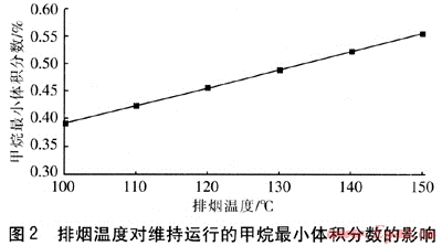 ② 排煙溫度對維持運行的甲烷最小體積分?jǐn)?shù)影響較大,當(dāng)排煙溫度在100~150℃時,維持運行的最小體積分?jǐn)?shù)為0.38%~0.56%,且隨排煙溫度的增加以線性關(guān)系遞增。