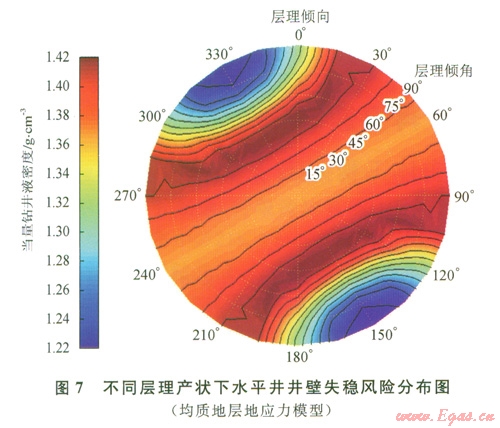 3)在鉆進地層傾角為30°~60°之間的頁巖氣藏水平井時,應(yīng)注意具有較高的坍塌壓力。近水平和近垂直的地層中坍塌壓力有所降低,降低幅度與地層傾向有關(guān),越接近最小地應(yīng)力方向下降幅度越大。