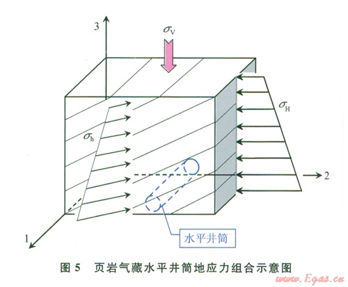 頁巖氣藏勘探開發(fā)需要大規(guī)模鉆井作業(yè),為保證產(chǎn)能頁巖氣藏一般采取水平井鉆井方式,因此有必要開展水平井井壁穩(wěn)定性研究。頁巖屬于典型的層理性巖石,在以往研究中,先后有學(xué)者建立和改進了層理性地層的定向井坍塌壓力計算模型[4-6],但是對于地應(yīng)力的處理方式都是按照均質(zhì)各向同性體進行的。這對于頁巖這種橫向各向同性體顯然不太合理,由于垂直和平行于層理面方向的彈性參數(shù)存在差異,常規(guī)的地應(yīng)力計算模型已不適用于頁巖地層。對此王越之教授[7]等人提出了橫向各向同性地層地應(yīng)力計算模型,本研究在考慮了有效應(yīng)力和地層傾斜的基礎(chǔ)上,改進了層理性地層地應(yīng)力計算模型,并初步探討了頁巖氣藏水平井坍塌壓力隨層理產(chǎn)狀的變化規(guī)律。