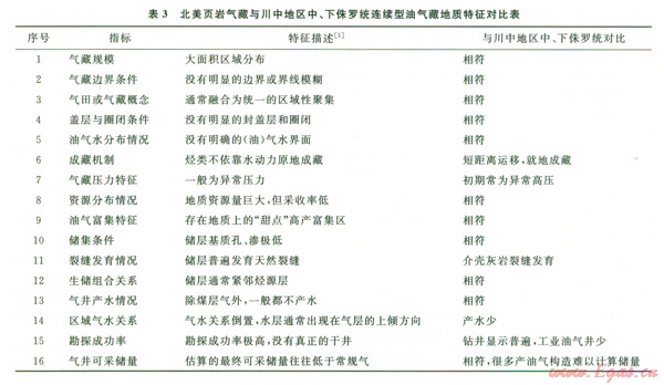 根據(jù)陳更生等[3]總結(jié)的北美頁巖氣藏l6種地質(zhì)特征與川中地區(qū)中、下侏羅統(tǒng)進(jìn)行對比的結(jié)果如表3所示。表3表明川中地區(qū)中、下侏羅統(tǒng)油氣藏,絕大多數(shù)條件具有與頁巖油氣藏類似的特征。如第9項:油氣富集特征,目前所獲常規(guī)油氣井,正是在“甜點”油氣富集區(qū)處,應(yīng)用常規(guī)(目前逐漸使用一些非常規(guī)的增產(chǎn)措施,如水平井,而酸化壓裂則早已引人使用)鉆井即能獲得工業(yè)油氣流,可以期待,隨著頁巖油氣藏開采技術(shù)的引進(jìn)應(yīng)用,必將獲得更大的油氣產(chǎn)量;而成藏機制和資源量則需要重新進(jìn)行研究和評價。