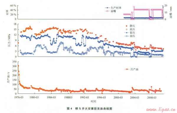 裂縫型油氣藏的生產(chǎn)特點是初始產(chǎn)量高、壓力下降快、能量衰減快、生產(chǎn)時間短。從柳X井的采油曲線來觀察,和許多川中地區(qū)其他構(gòu)造侏羅系的采油生產(chǎn)曲線特征相似——初始表現(xiàn)出裂縫型油氣藏的特點:初始產(chǎn)量高、持續(xù)時間短、壓力下降快、連續(xù)生產(chǎn)時間短(該井在2001年之前沒有生產(chǎn)時率的紀(jì)錄,在有記錄的2001年1月-2010年4月整個生產(chǎn)過程中,生產(chǎn)時率介于2%~l2%,平均時率為6.1%。有些更低者可在2%左右,普遍小于20%);但是后期隨著時間的推移(2004年以后生產(chǎn)時率在3%以下),這時生產(chǎn)壓力會在較低壓力處恢復(fù)穩(wěn)定(圖4),總的生產(chǎn)時間長(有些井間歇性產(chǎn)油可達(dá)數(shù)十年,如柳X井:1976-2010年,柳X井大安寨段油氣藏最終累計產(chǎn)原油達(dá)數(shù)萬噸)。