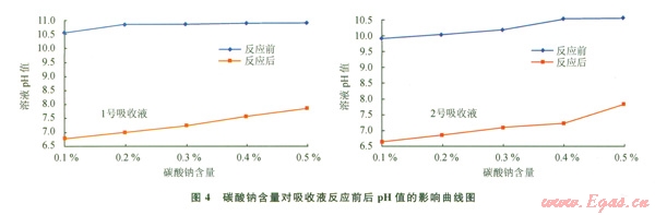 吸收液:水+4%膨潤土,并用無水碳酸鈉與氫氧化鈉調(diào)節(jié)吸收液pH值,結(jié)果見圖6。