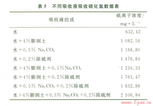 不同吸收液組成吸收硫化氫效果數(shù)據(jù)見表5。