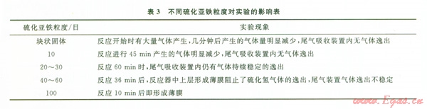 硫化氫氣體發(fā)生裝置中采用硫化亞鐵與稀硫酸按一定比例進行反應(yīng)生成硫化氫氣體。實驗過程中硫化氫氣體產(chǎn)生的速度不夠穩(wěn)定,這主要與反應(yīng)物硫化亞鐵的粒度以及反應(yīng)溫度有關(guān)。實驗采用