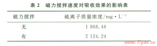 在吸收裝置中加有磁力攪拌來模擬井底流體的擾動,以期獲得吸收劑盡可能達到最大吸收效果。由于儀器條件的限制,實驗確定磁力攪拌器的轉(zhuǎn)速以磁轉(zhuǎn)子不產(chǎn)生跳動的最大穩(wěn)定轉(zhuǎn)速進行實驗,結(jié)果見表2。由表2可以看出吸收裝置中是否加有磁力攪拌,對吸收劑吸收效果影響較大,說明流體流動形態(tài)對氣液兩相傳質(zhì)有很大影響。