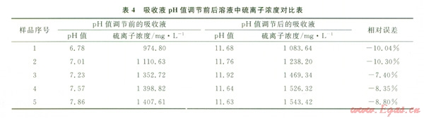 實驗發(fā)現(xiàn),吸收液在吸收硫化氫反應(yīng)后溶液的pH值都低于l0。結(jié)合圖7中所示水溶液中硫化氫存在形態(tài)與溶液pH值的關(guān)系可知:在此pH值范圍內(nèi),吸收液中硫化氫主要以H2S和HS-的形態(tài)存在。分析在這種條件下用碘量法測得的硫離子含量不能真實地反映出吸收液中硫離子的含量。因此要在滴定前調(diào)節(jié)吸收液的pH值大于11,在此pH值范圍內(nèi)溶液中硫化氫主要以S2-的形式存在。這樣可以接近真實的反應(yīng)吸收液中硫化氫的含量。取圖4中1號吸收液吸收硫化氫反應(yīng)后的溶液,對比分析pH值調(diào)節(jié)前后的數(shù)據(jù),結(jié)果見表4。