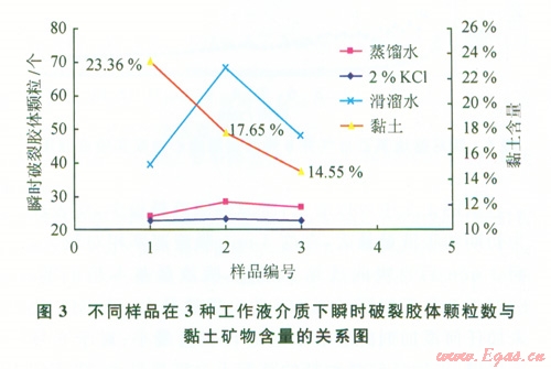 圖2顯示了頁巖的水化分散速度(m)與黏土礦物含量的關系。2%KCl及蒸餾水在高黏土礦物含量下,具有較好的抑制性能,而在低黏土礦物含量下,其抑制性能對黏土礦物含量的變化不敏感;而滑溜水的抑制性能相對較差,但其抑制性能與黏土含量相關。圖3顯示了瞬時形成膠體顆粒數(shù)目(b)值與黏土礦物含量的關系。3種液體都顯示出在高黏土礦物含量情況下,抑制性能較好。