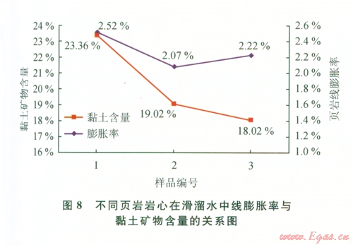 通過對實驗結果的綜合分析,認為頁巖的膨脹性與黏土礦物含量存在一定的相關性,當黏土礦物含量變化較大時,頁巖的膨脹率與黏土礦物含量關系更為密切。
