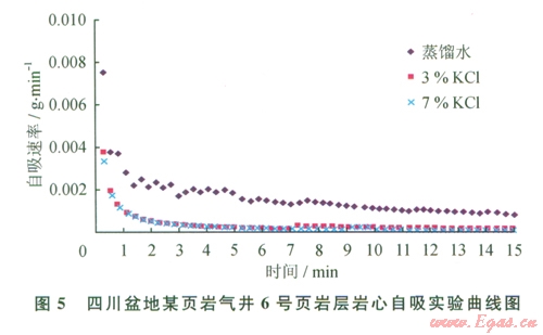 從圖4、5中可以看出:①總的吸液量極少,均表現(xiàn)為初期的吸液量最大,在前3 min吸液速率相對較大,而3 min后自吸曲線趨于平直,吸液量基本趨于零。②對于5號頁巖層,3%KCl的自吸量最大,7%KCl及未加任何添加劑的蒸餾水巖心自吸量最??;對于6號頁巖層,未加任何添加劑的蒸餾水自吸量最大,3%KCl和7%KCl的自吸量最小。③不同層段的頁巖吸液量具有明顯的差異,與黏土礦物含量相關,黏土礦物含量較高的5號巖心吸液量高于含量較低的6號巖心。
