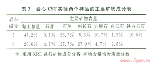 選取兩個不同層段的巖心進行了CST實驗,兩個巖心的主要礦物成分見表3,圖4、5顯示了不同層段頁巖的巖心自吸實驗結果。
